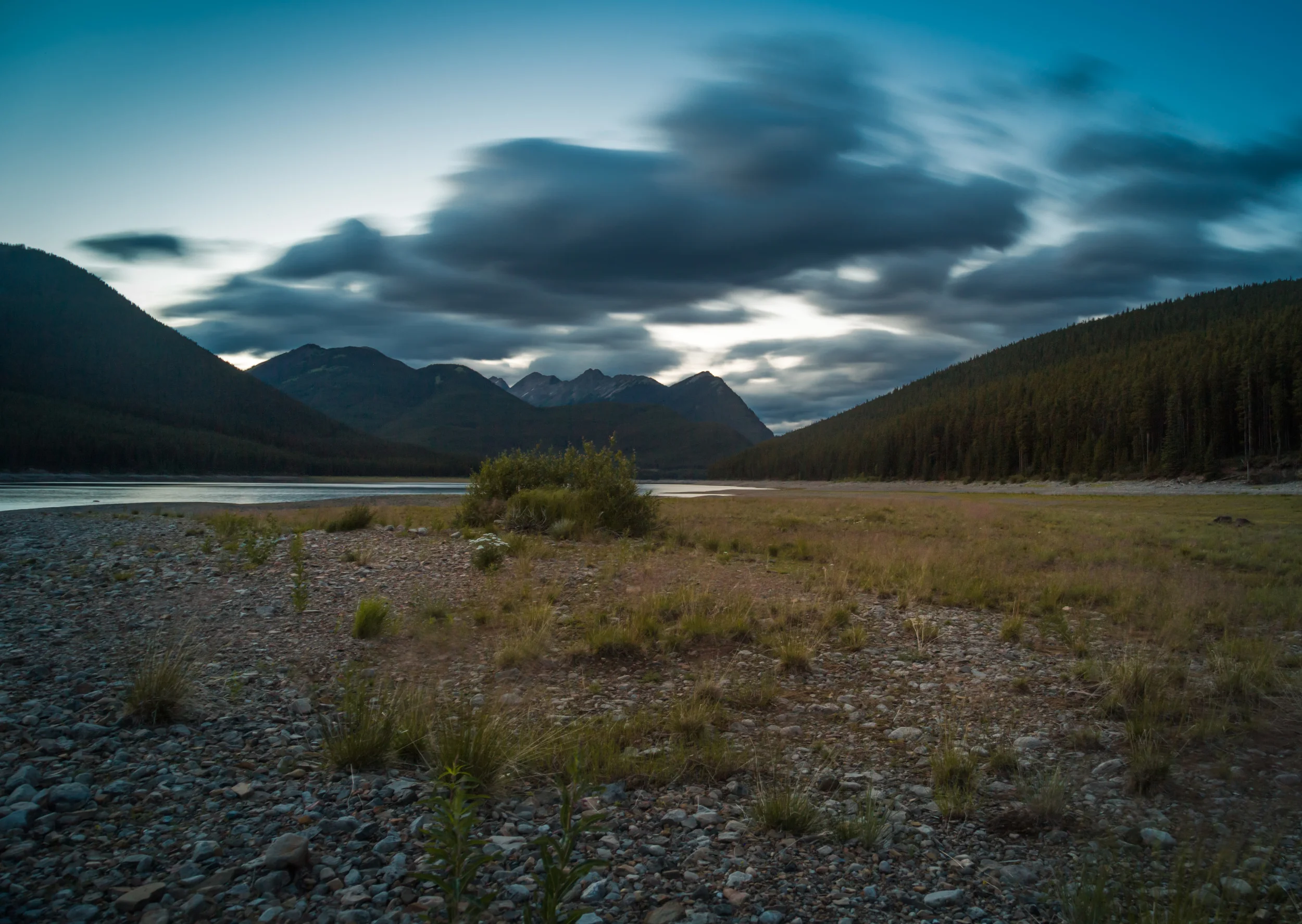 Lower Kananaskis Lake in July with the low water levels as part of the flood mitigation strategy.